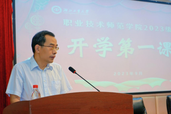 蔡光兴代表学校对全体新生的到来表示诚挚欢迎。他非常高兴地看到同学们选择了湖北工业大学,与同学们畅谈了自己的求学经历。他希望,职师学院学生要热爱学校、热爱学院、热爱专业,学会规划大学生活;要吃苦耐劳、不懈奋斗,掌握科学的学习方法;要无私奉献,常怀感恩之心,做有责任、有担当的湖工青年。