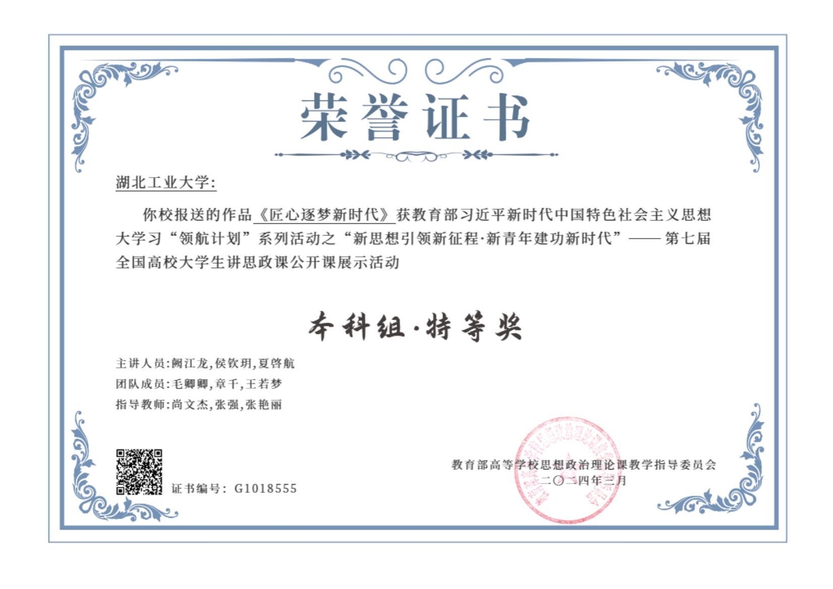 近日,教育部高等学校思想政治理论课教学指导委员会公布喜讯,在教育部习近平新时代中国特色社会主义思想大学习“领航计划”系列活动之“新思想引领新征程·新青年建功新时代”——第七届全国高校大学生讲思政课公开课展示活动中,湖北工业大学报送的作品《匠心逐梦新时代》荣获本科组特等奖,职业技术师范学院21级计算机(师资)1班夏啓航为主讲人员之一。