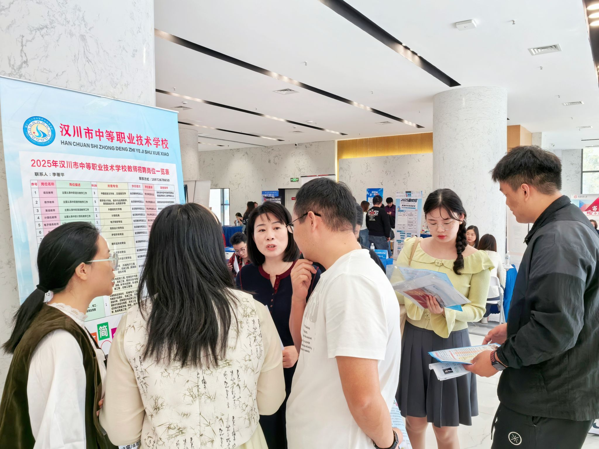 汉川市中等职业技术学校、武汉市石牌岭高级职业中学、武汉市第一职业教育中心、孝感市工业学校、监利市职教中心、枝江市职业教育中心(宜昌技师学院)、大悟县中等职业技术学校、云梦县职业教育中心、十堰高级职业学校等9所职业学校现场参会,另有10余所职业学校委托湖北工业大学职业技术师范学院线上推荐人才。招聘专业覆盖文化课、专业课。