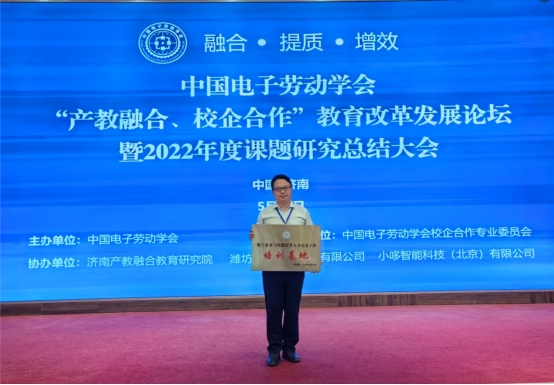 5月18日,中国电子劳动学会校企合作专业委员会在山东济南召开教育教学发展论坛暨课题结题总结大会,会议期间举行了数字素养与技能提升人才培养工程培训基地授牌仪式。我院教师徐顺博士参加会议并代表学院领牌。