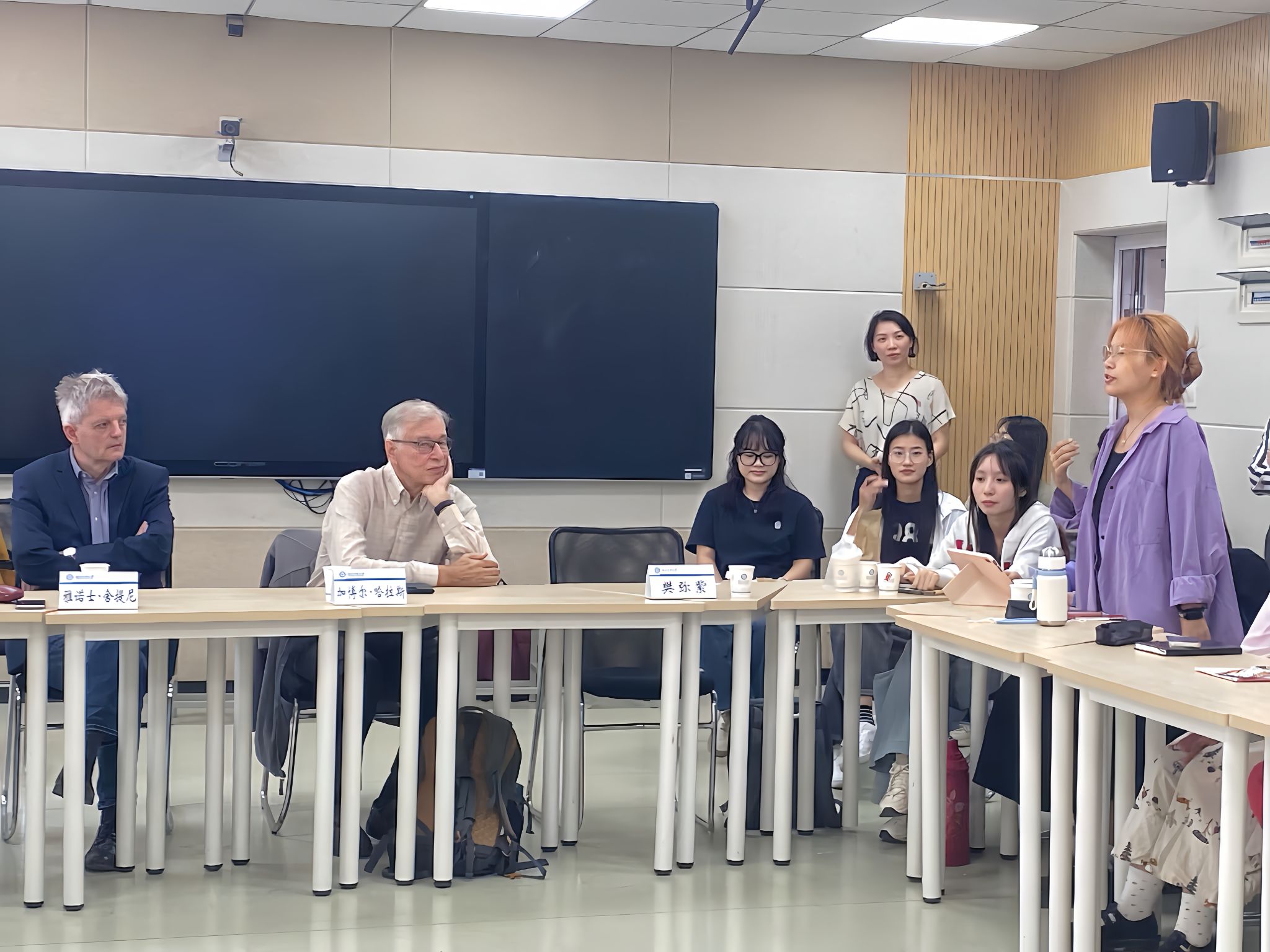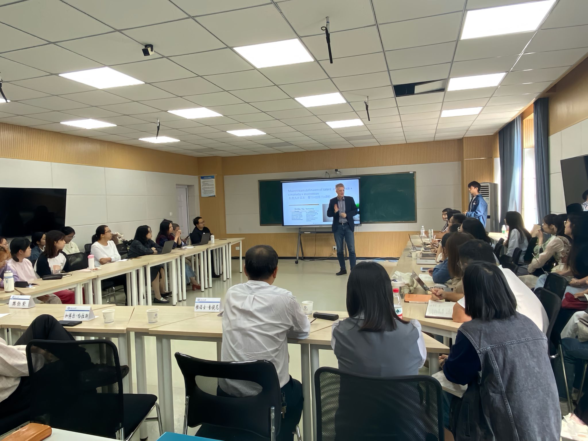 两位教授围绕“职业教师应更侧重于与产业的合作还是专注于理论教育和研究”为切入点与在场的同学积极互动,并针对他们的回答和提问给予了详细解答。雅诺士·舍提尼教授指出,学生与企业之间存在着相互促进的关系;企业的生产实践与理论的结合,有助于高校毕业生将所学知识应用于实际,从而推动企业更好地发展。随后围绕人才识别、培养和管理以及文化背景的影响进行展开讲授,进一步探讨了人才管理的区域性、中国学生的创新、自律表现以及与行业合作的潜力等。