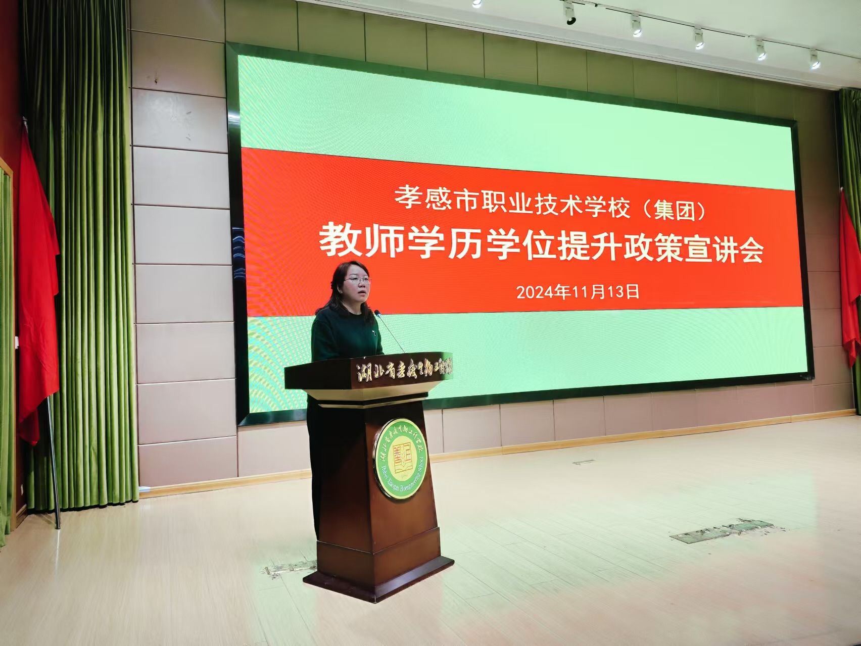 11月13日,我院在孝感工业学校开展了2024年教师学历学位提升政策宣讲会。本次宣讲会由周越超老师主讲,孝感市工业学校黄晶主任主持。