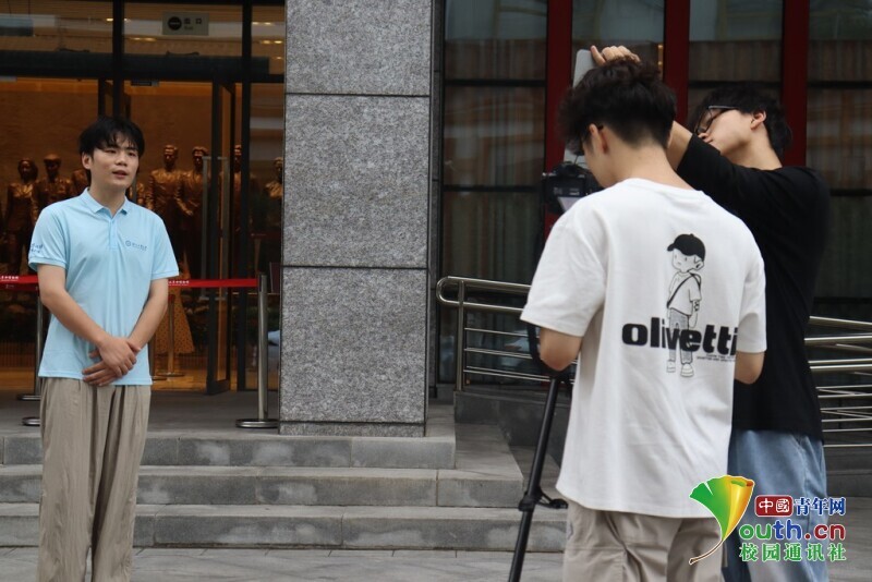 图为服务队成员确定拍摄走位。 江淑雅 供图