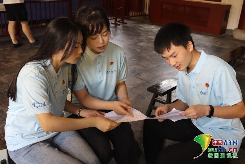 图为服务队成员确认脚本台词。 江淑雅 供图