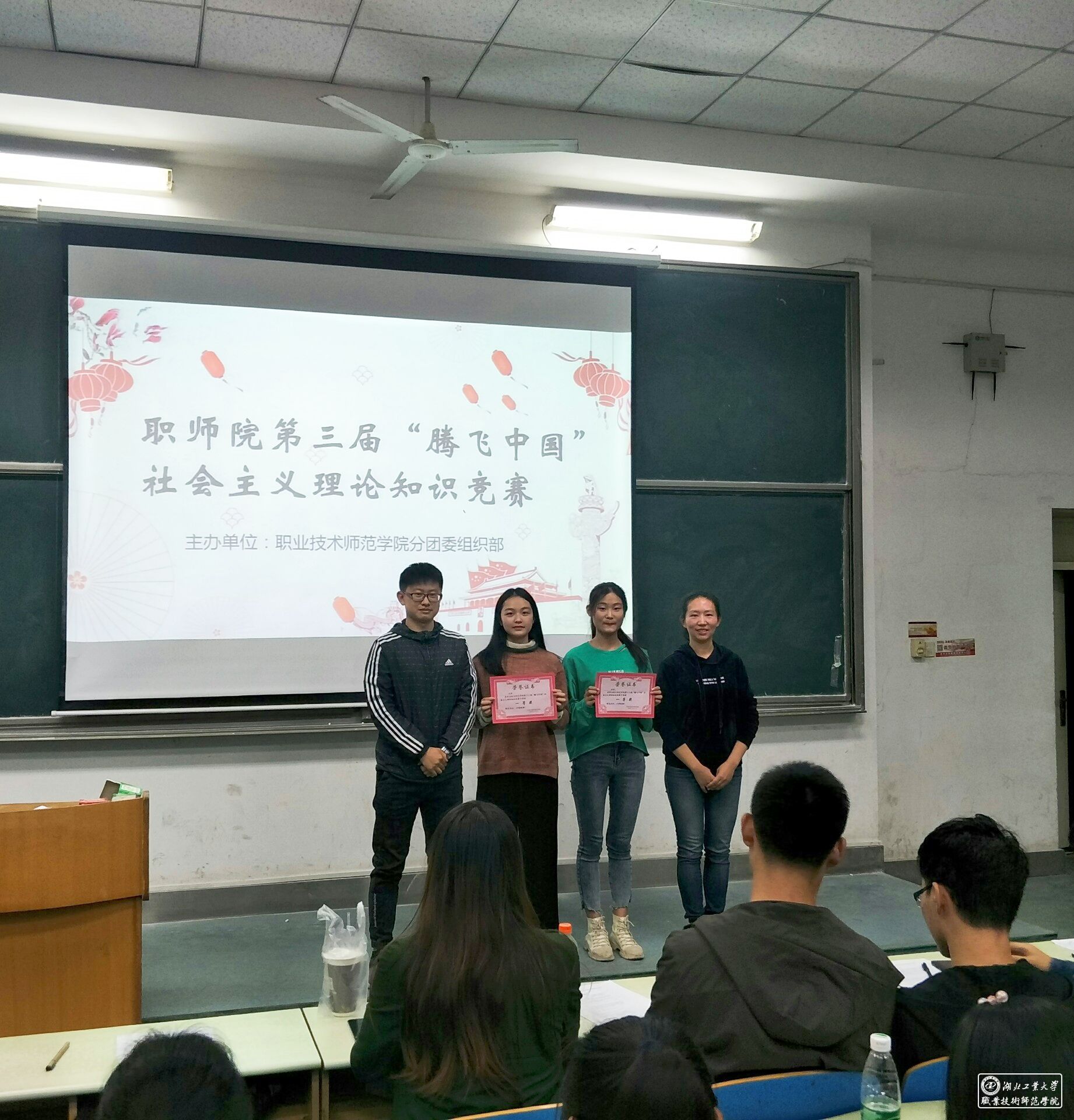 11月4日晚,职业技术师范学院第12届“腾飞中国”社会主义理论知识竞赛在教学楼工一001教室成功举行。出席本次比赛的评委有学院分团委书记章莹老师、学工办柳皓严老师以及分团委、学生会主席团的成员们。伴随着激烈的掌声,比赛正式拉开帷幕。