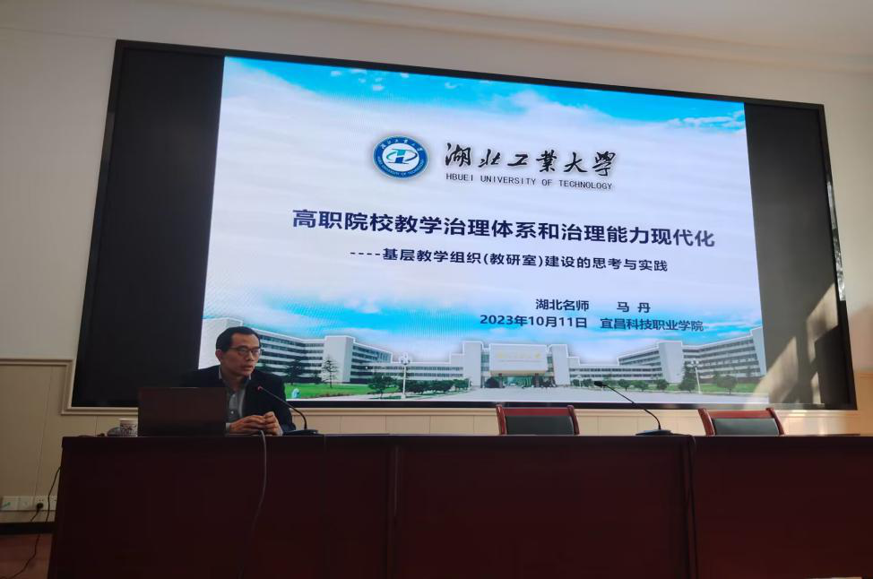 为充分发挥湖北省“教育学”名师工作室平台作用,显著提升地方职业院校教学治理能力,2023年10月11日教育学名师工作室首席专家马丹教授及团队成员前往宜昌科技职业学院开展交流服务工作。宜昌科技职业学院为新升格的高职院校,前身为宜昌机电工程学校,是一所国家级重点中职院校。针对宜昌科技职院的校情,帮扶学校更快、更准适应高等职业教育办学规律,马丹教授首先为其开展题为“高职院校教学治理体系和治理能力现代化——基层教学组织(教研室)建设的思考与实践”的专题讲座。