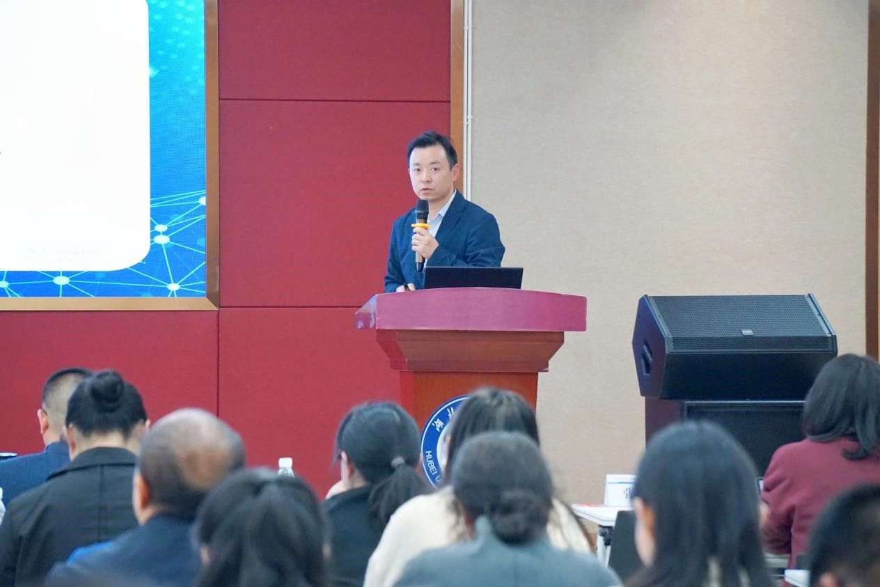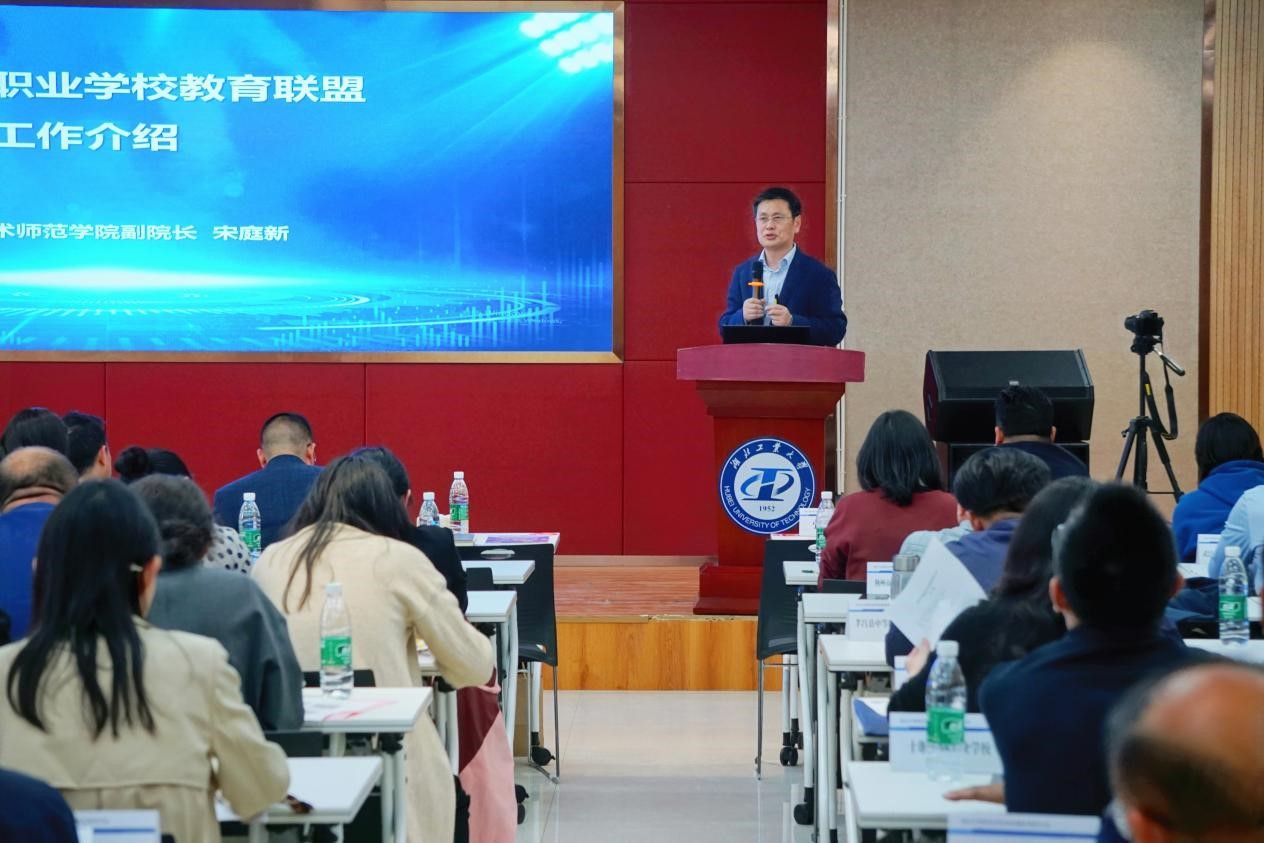再次,湖北工业大学职业技术师范学院副院长宋庭新以《智能化、数字化助力下的中职学校整校教学质量提升》为题介绍湖北中等职业学校教育联盟工作。报告从虚拟教研室(含论文大赛)、教师工作坊、教学能力提升、教师学历晋升、专家讲座报告展开,介绍了职师学院、中职联盟能够提供的职业院校教师能力提升,职业院校专业(群)、课程建设,职业院校整校提升,双优校、双高校申报、验收等职业院校横向服务项目包。