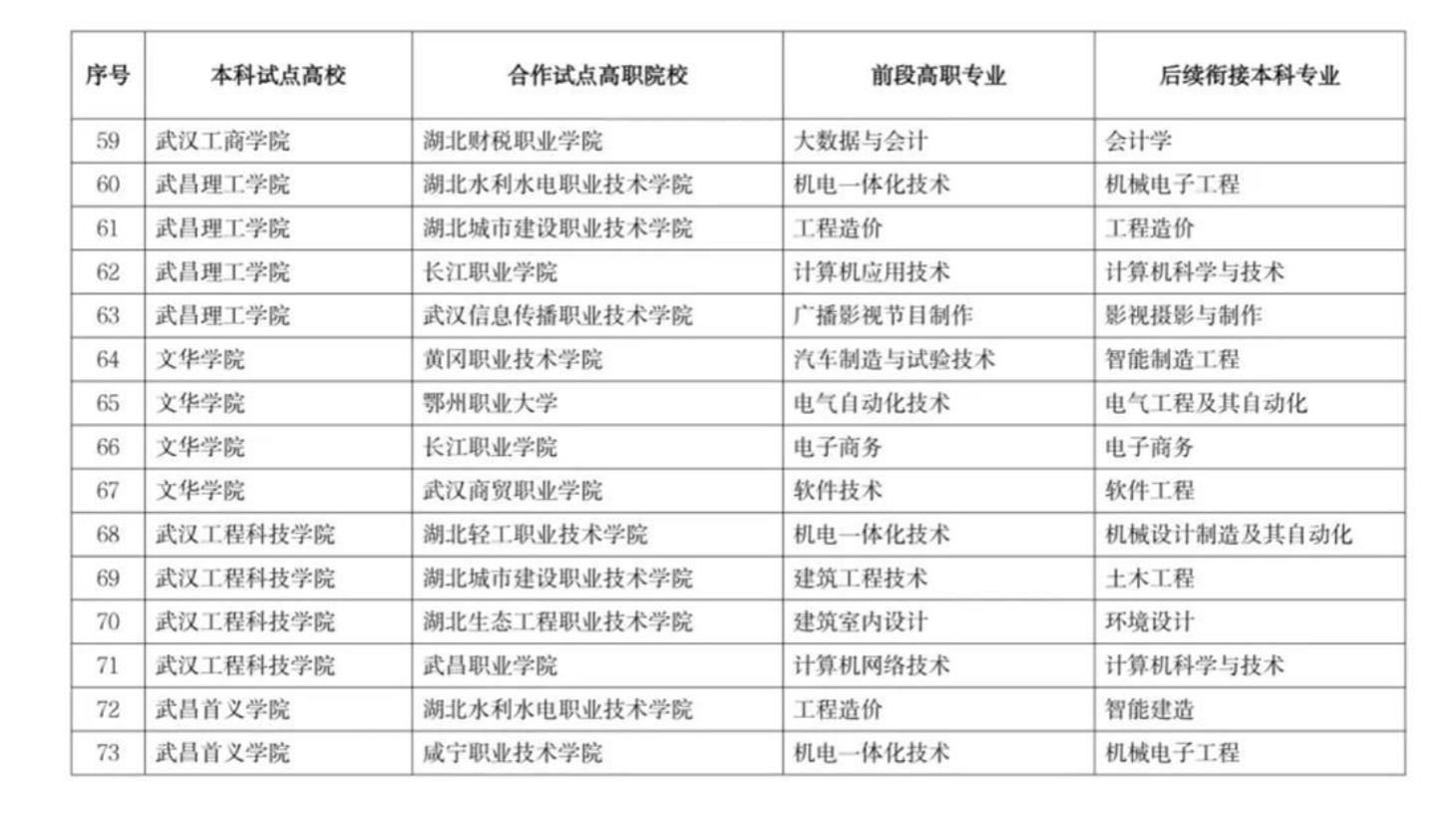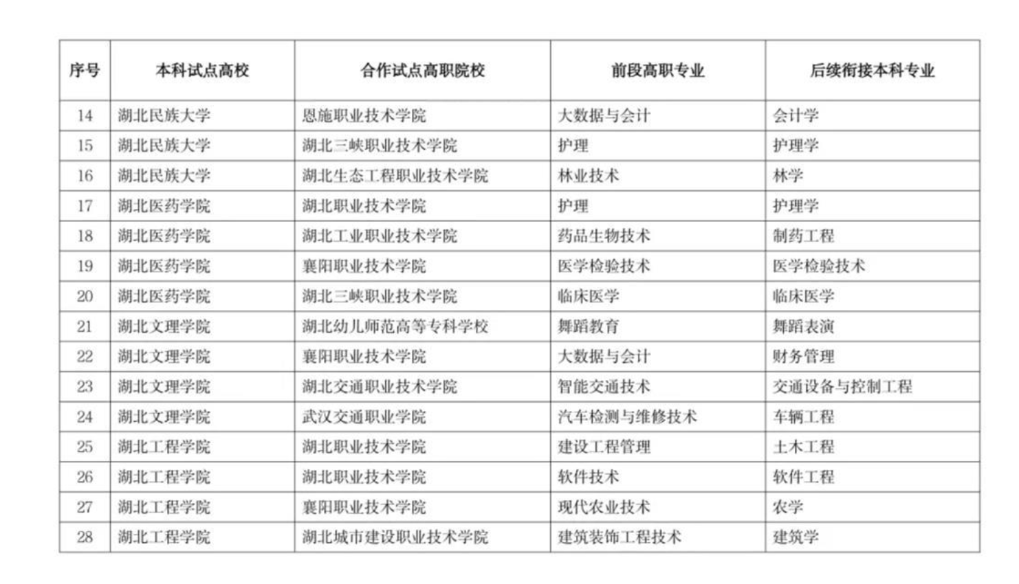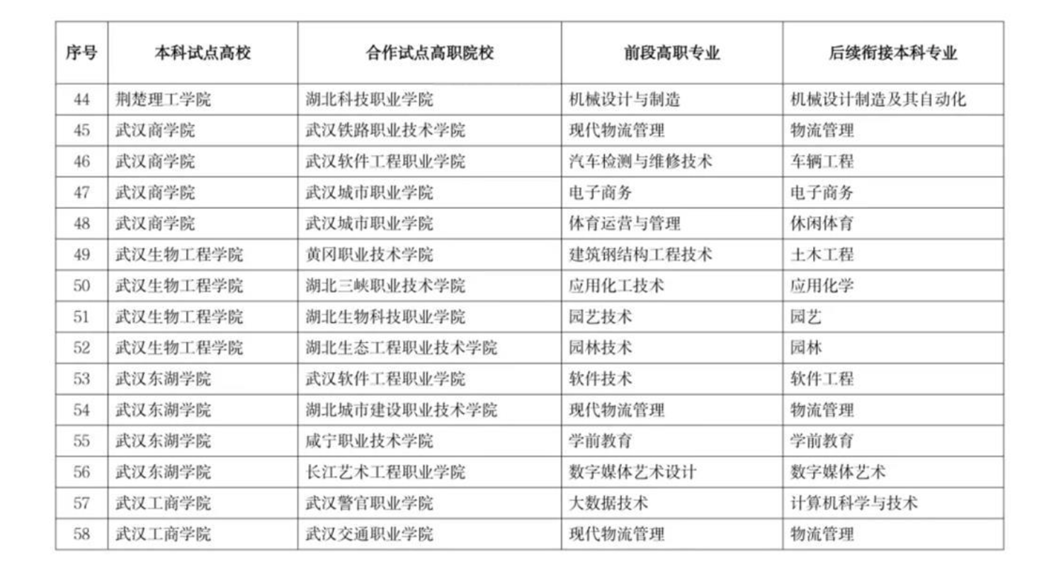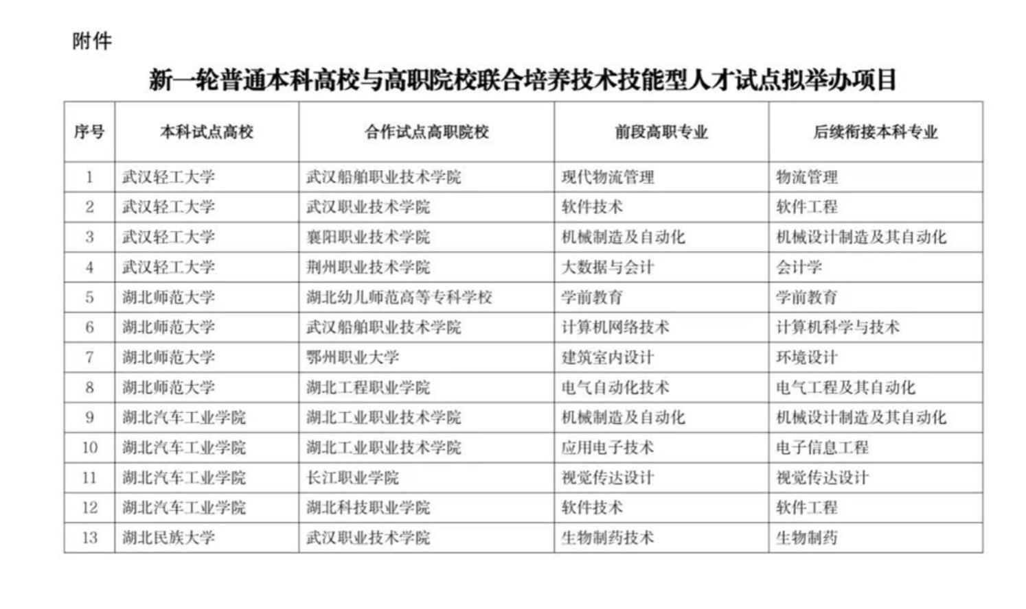 据湖北省教育厅通知,拟同意武汉轻工大学等20所本科高校和33所高职院校,联合申请举办79项普通本科高校与高职院校联合培养技术技能型人才试点项目,现将拟举办项目予以公示,公示期自2024年5月6日起至5月9日止。