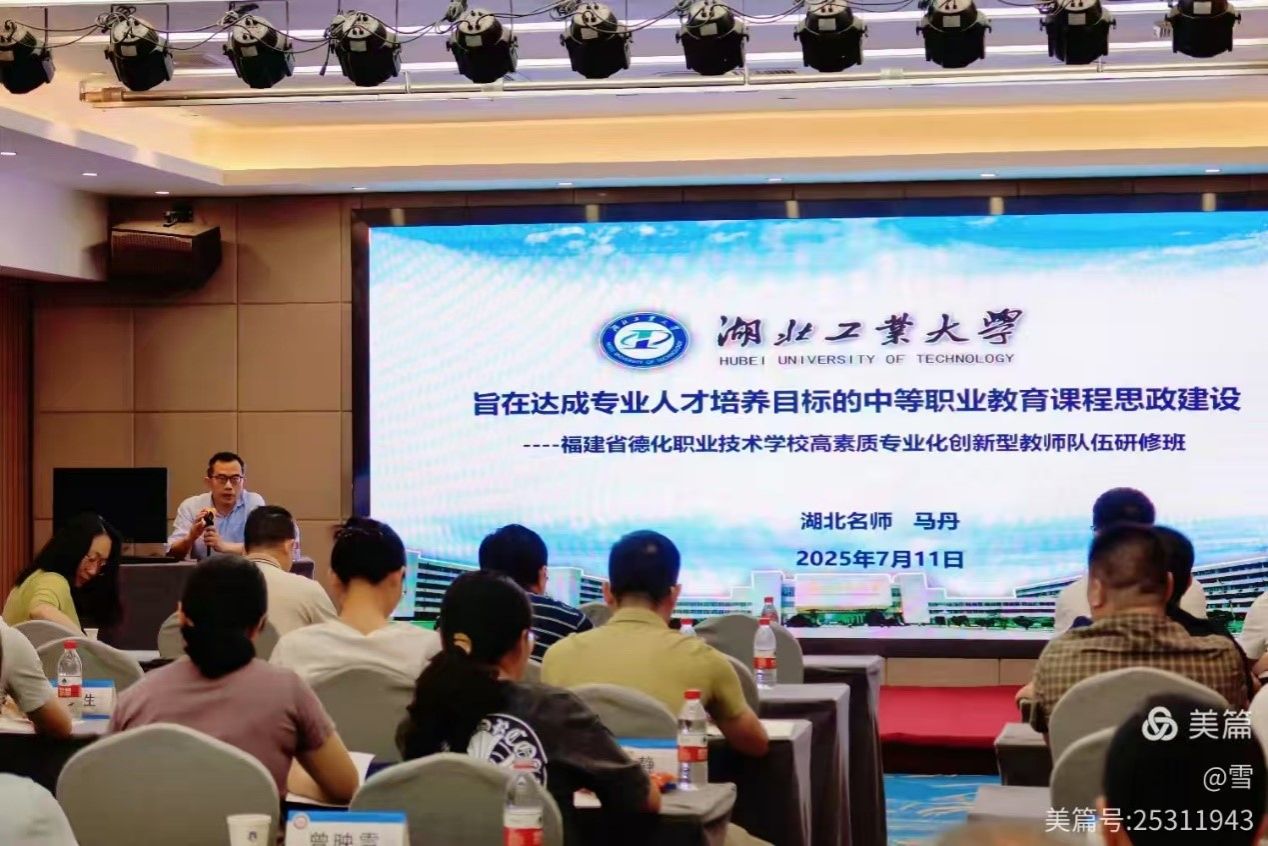 2025年7月11日,湖北省教育学名师工作室为助力中等职业教育教师提升课程思政建设水平,在研修场地开展以“旨在达成专业人才培养目标的中等职业教育课程思政建设”为主题的研修活动 。此次活动面向福建省德化职业技术学校高素质专业化创新型教师队伍,由湖北工业大学职业技术师范学院院长、教育学名师工作室的马丹教授主讲。