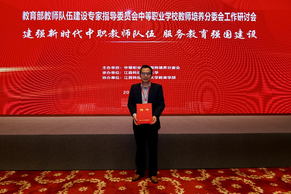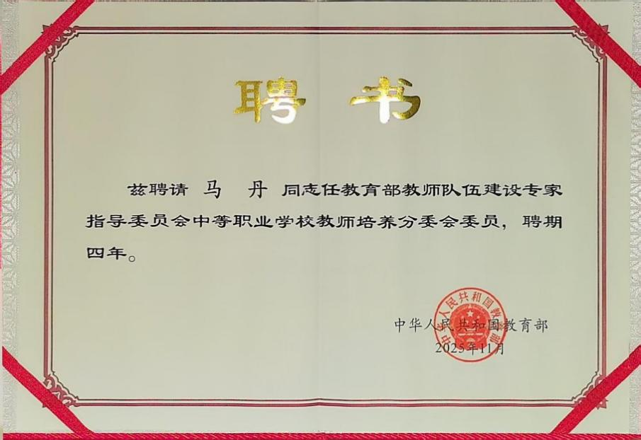 在大会上,马丹教授获得教育部颁发的聘书。马丹教授的成功入选,不仅彰显了学校在职业教育师资培养领域的深厚积淀,亦是马丹名师工作室长期以来坚持深耕职教领域研究的肯定,为名师工作室进一步强化责任使命拓展了新的平台。